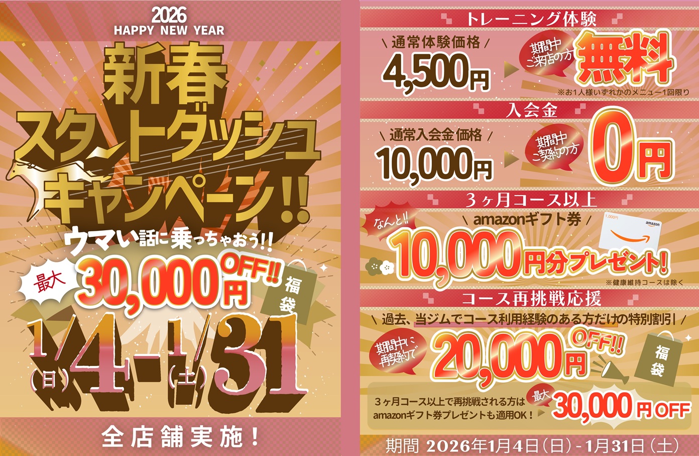 パーソナルトレーニング、ピラティス、ヨガ、キックボクシング、骨格矯正など、複合的なオーダーメイドメニューを提供するパーソナルジム『E9th PRIVATE GYM(イーナインス)』を運営する株式会社e9th(本社:長野県長野市、代表:小柳竜也)は、2026年1月4日(日)から1月31日(土)までの期間限定で、お得な「新春キャンペーン」を実施いたします。